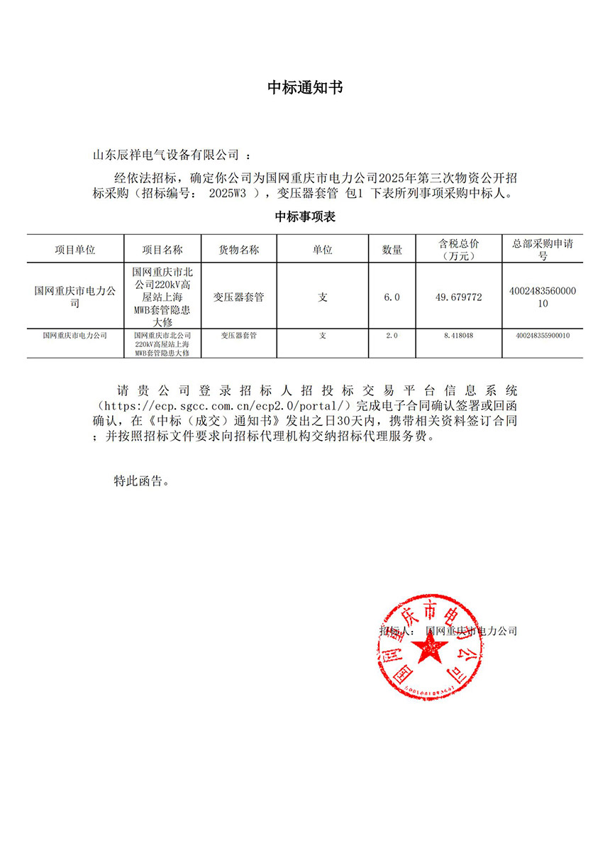 • 2024.12.18 變壓器套管中標(biāo)通知書(shū)