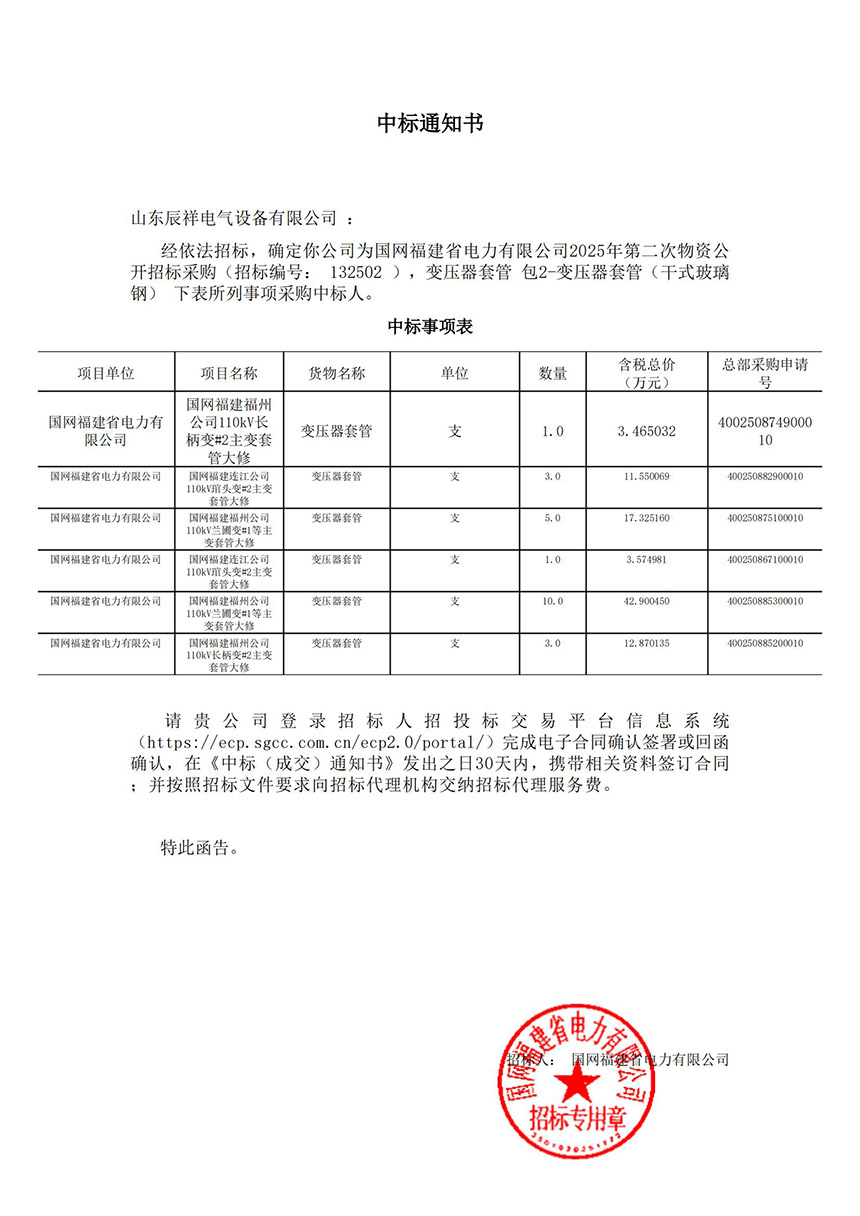 • 2025.02.14 110kV瓷絕緣穿墻套管中標(biāo)通知書(shū)